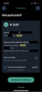 We entered a small test amount (€0.01). The UI asked for the amount and, optionally, a message. After that, we tapped “Continue” and “Confirm.”