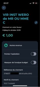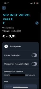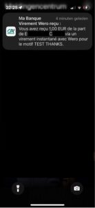Receiving is equally simple. Bank notifications showed us immediately that we’d received a Wero transaction. From Wero’s documentation: transfers happen in under 10 seconds. Our ledger immediately showed the received transaction with all details.
