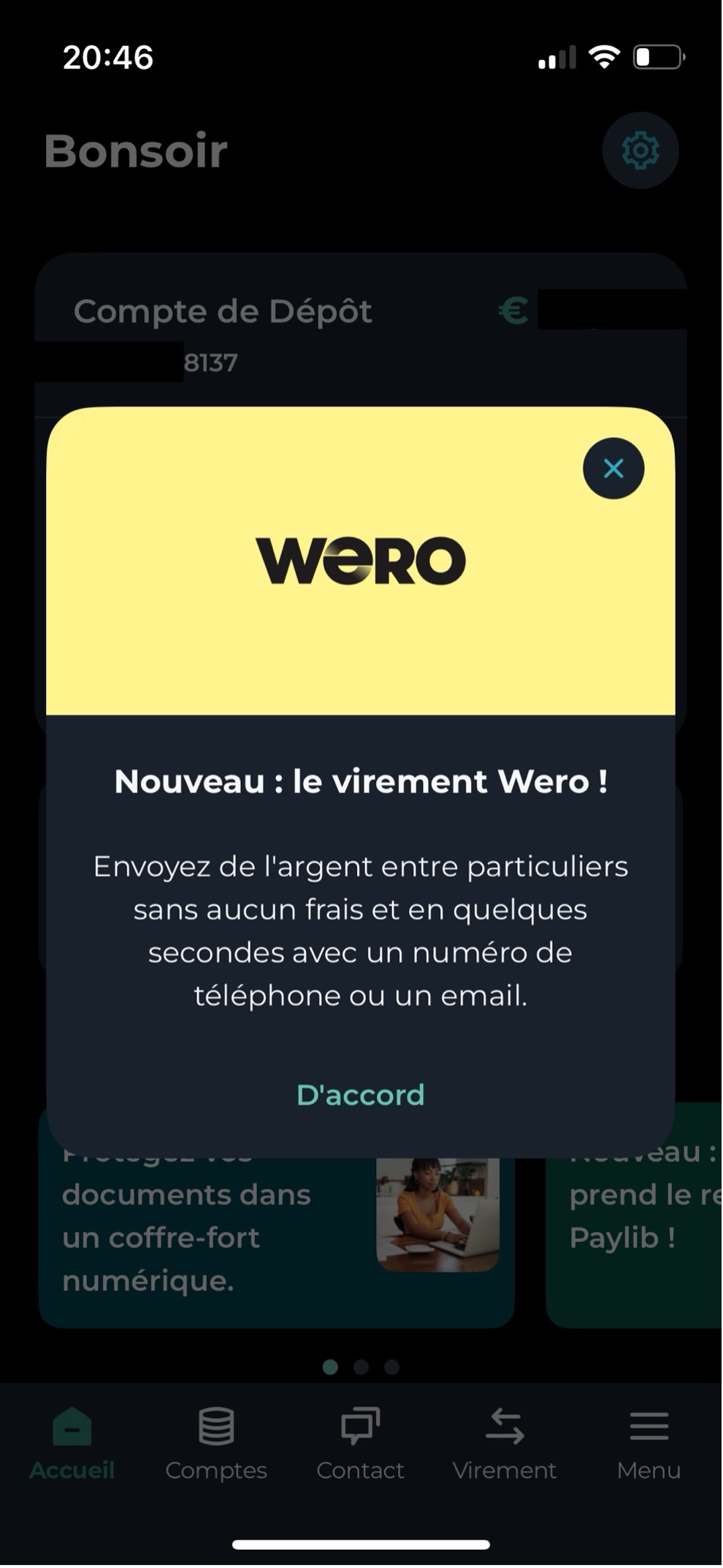 We opened our Credit Agricole app in France where Wero is supported. The bank was clearly promoting Wero with a welcome message: “New, the Wero transfer!”