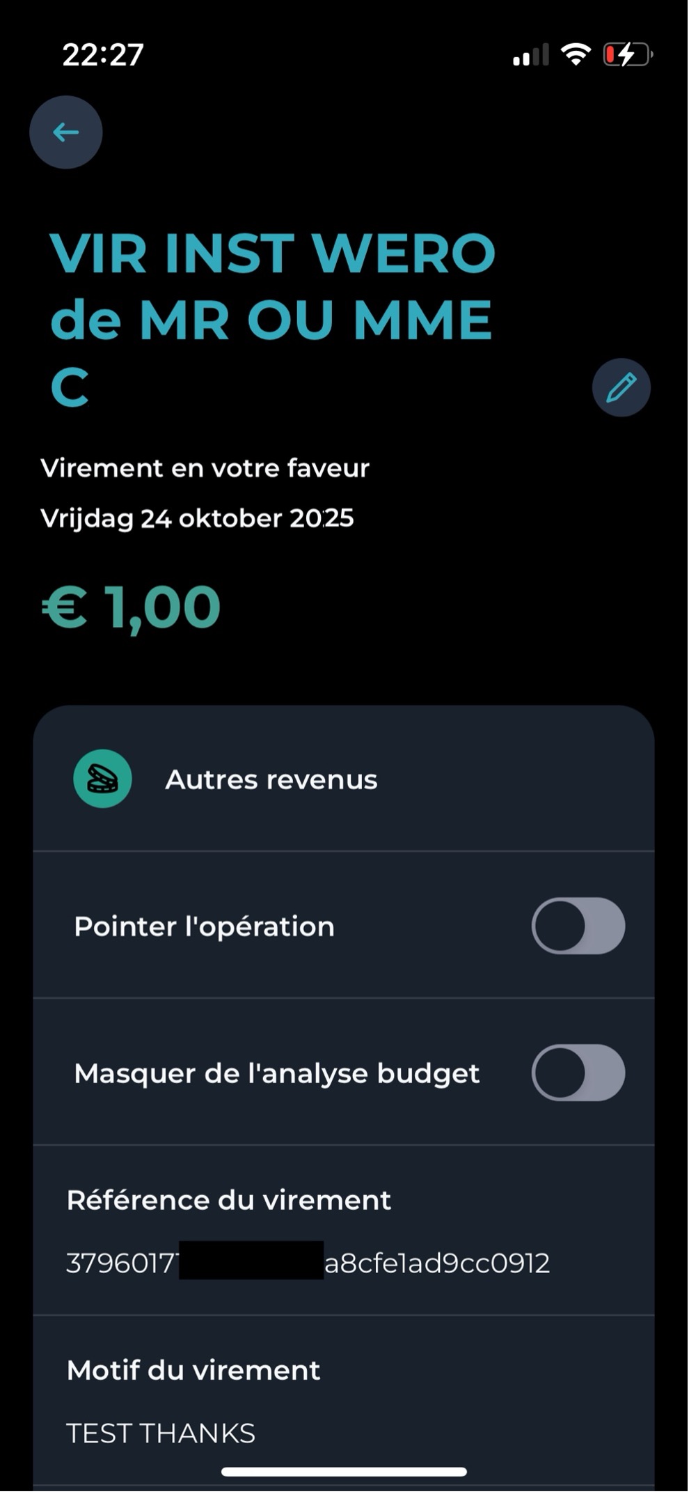 Receiving is equally simple. Bank notifications showed us immediately that we’d received a Wero transaction. From Wero’s documentation: transfers happen in under 10 seconds. Our ledger immediately showed the received transaction with all details.
